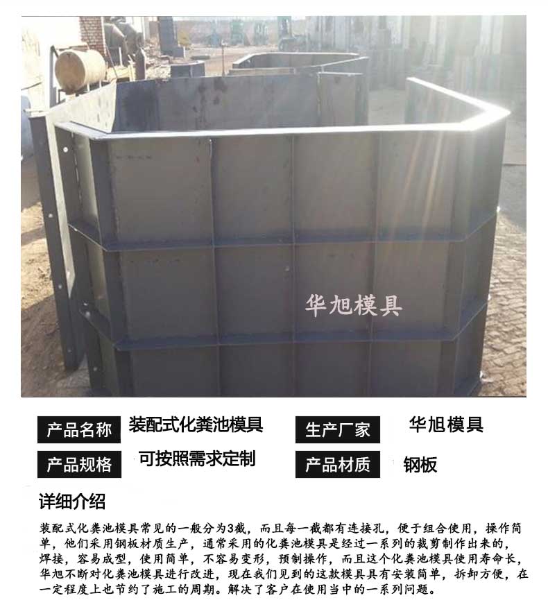 華旭生產(chǎn)的裝配式化糞池模具,它的容積比較多,包括20、40、50立方等,可根據(jù)具體的需要進(jìn)行組合使用,它的長度,尺寸等都可以滿足我們的施工需求,8mm的鋼板材質(zhì),滿足我們的需求,不容易變形。