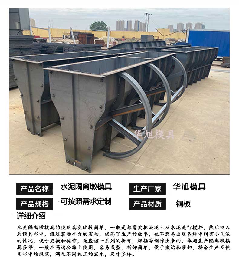 客戶(hù)反饋:經(jīng)過(guò)多家了解,后來(lái)選擇了華旭的水泥隔離墩模具,脫模速度快,使用效率高,而且節(jié)約了我們的施工周期,耐磨性強(qiáng),可重復(fù)操作及使用,一般情況下使用了好多年,容易成型,操作簡(jiǎn)單,值得信賴(lài)。