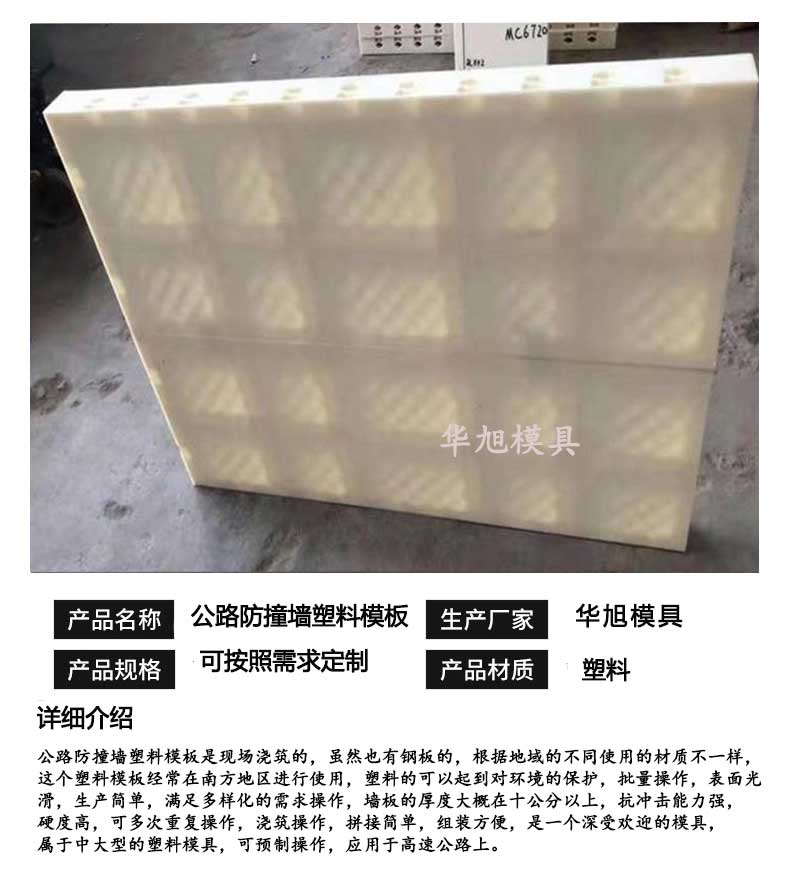客戶反饋:我們在很多地方進行施工過,遵義,銅仁,畢節(jié),安順,都勻,云南.昆明等,這些地方都是選擇的華旭模具的公路防撞墻塑料模板,運輸方便,重量輕,價格也不貴,還可以多次重復使用,可批量操作,價格優(yōu)惠,值得選擇。