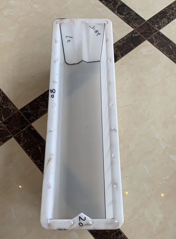 倒角設計的路緣石模具,其內徑澆筑尺寸為50*30*10CM,倒角部分為2*2CM斜面設計。