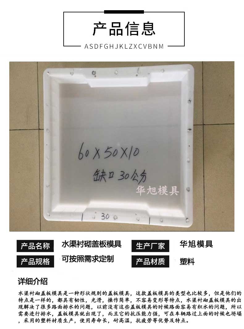 華旭可根據(jù)客戶需要定制200mm*400mm*100mm、250*500*80mm、250*500*120mm、300*500*100mm、300*450*100mm等各種規(guī)格型號(hào)的蓋板模具。
