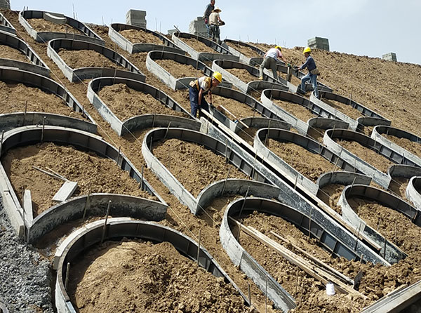 現(xiàn)澆拱形骨架模板俗稱拱形骨架模板,,拱形骨架模具,是山體護坡必不可少的模具,工作可靠,維修簡單,使用的費用低,經(jīng)濟耐用等特點,結(jié)構(gòu)和性能占有一定的優(yōu)勢,是由拱加副拱、截水槽和上面的直桿組成。大概在260-360公斤之間,符合基本的標準和特點。